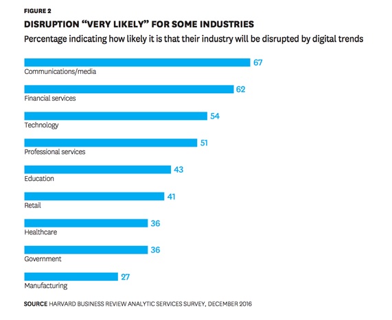 Some industries seem to be more receptive than others to the prospect of transformation, with communications/media companies, financial services and technology companies being the first to recognize that they are “very likely” to be affected by digital transformation.