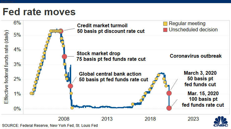 The new fed funds rate, used as a benchmark both for short-term lending for financial institutions and as a peg to many consumer rates, will now be targeted at 0% to 0.25% down from a previous target range of 1% to 1.25%.