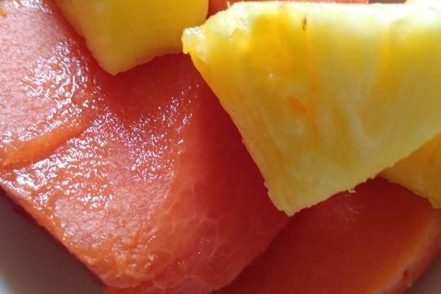 - Serve cut up papaya and pineapple in a fruit bowl.