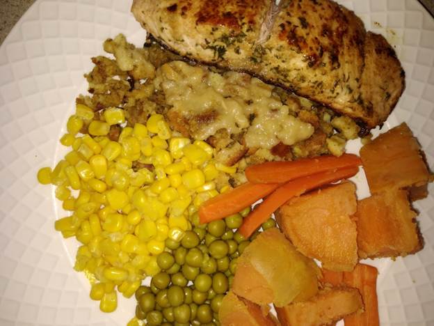 - On a plate, serve sliced turkey, carrots, yam, potatoes, peas and gravy on top of turkey and potatoes.