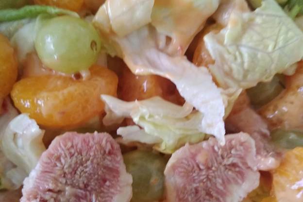 - Add in drained can or cup mandarin and sliced fig fruits.