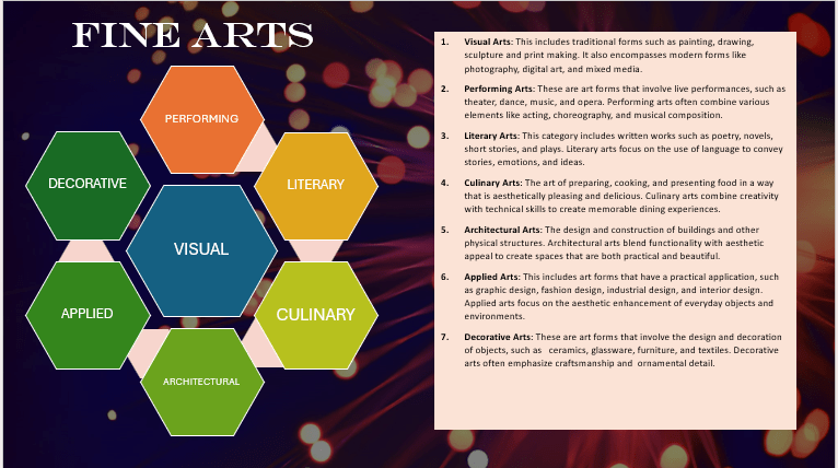 Literary Arts: This category includes written works such as poetry, novels, short stories, and plays. Literary arts focus on the use of language to convey stories, emotions, and ideas.
